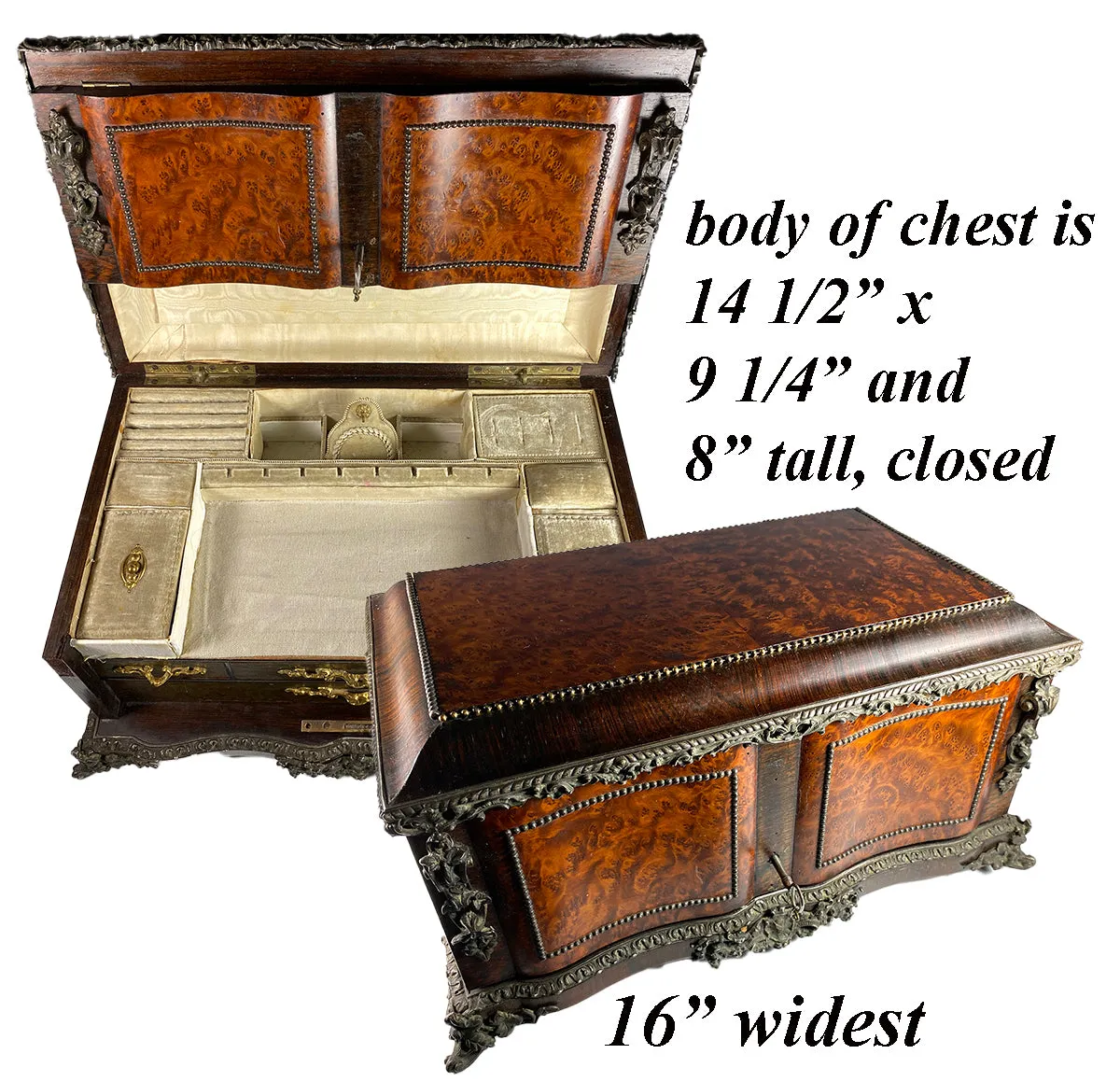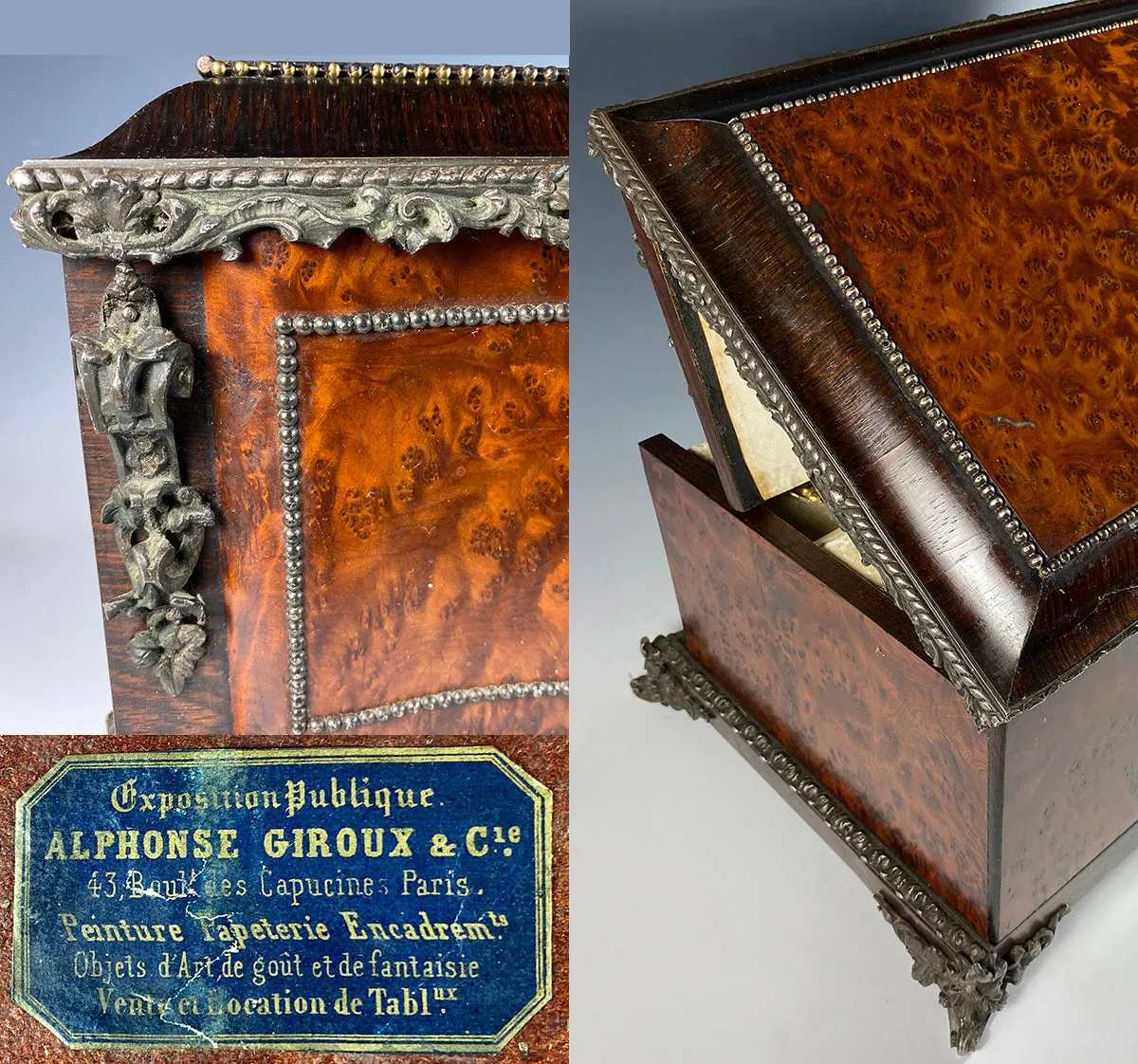 Alphonse GIROUX is a superb maker, purveyor of luxury goods, 19th century Paris. The original label is on the bottom of this box and is fully intact. Shown in images. The maker would be equivalent to a Tiffany in the USA, underlining the quality and prestige. A truly magnificent c.1840-70 French jewelry chest, casket, large in size and with the old original fittings still in very nice condition for age and type. I'm sure that it would have originally had 2 scent bottles in those open fittings, and I've pulled a set we have in inventory to put in for a couple of the photos just so you can picture it in a more original form. I've also given dimensions of those 2 openings so you can hopefully find a pair among your own that can fit and give it a more complete presentation. While it is a jewelry box, it's the kind of one that is fabulous to display collections of all kinds, from jewelry to micro mosaics, to portrait miniatures or any smaller items of value - coins, mourning brooches. The inclusion of the 4 beautiful drawers which open once it is unlocked and the upper half folded up and back also make superb spots to open and display a collection. Larger than any fitted jewelry box we've had, it still also has the pocket watch holder/stand there in center back. You see fittings for rings, earrings, pendants/chains and compartments for "etc.". In my final photo, I've shown it with a variation of items to show you what I mean. The old burled wood and the serpentine front, cast appliqués and trims are a combination of rich elements which culminate in a truly exquisite chest, closed. The original key still attends and the lock does work. Full measurements are noted on the photos.